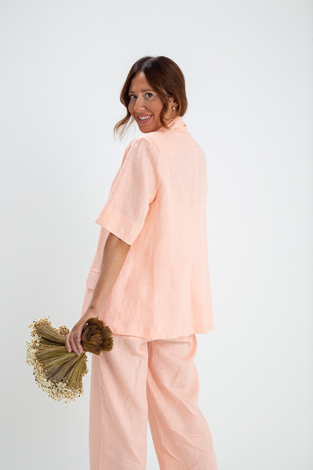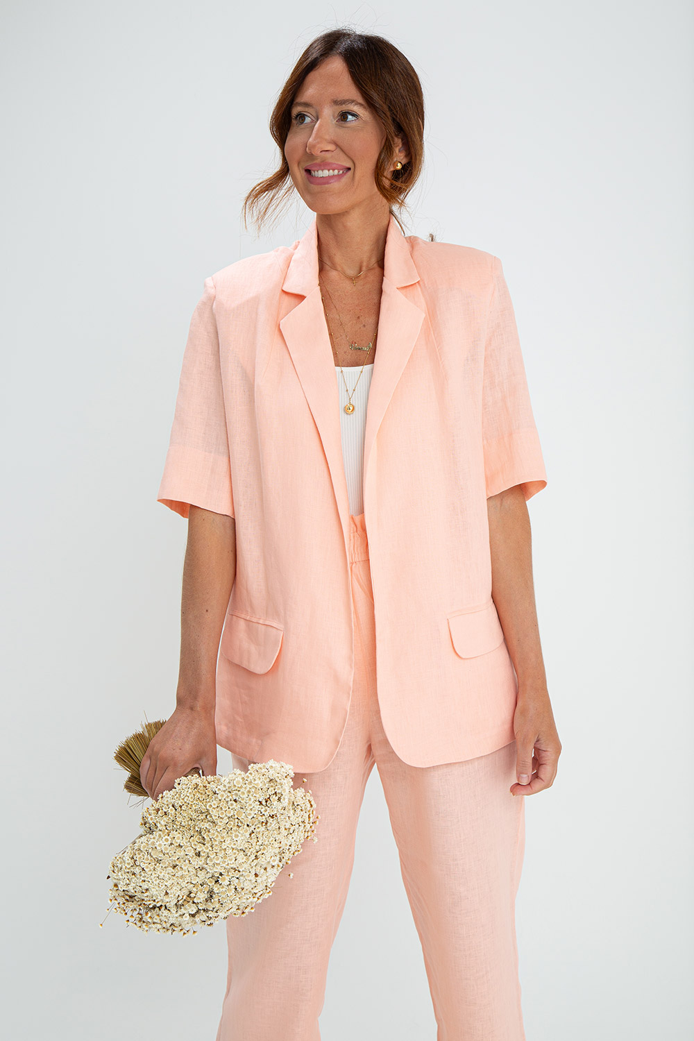 O blazer Veneza em 100% linho, possui manga curta e corte impecável, trazendo sofisticação para um estilo mais casual e descontraído do dia a dia, mas que também fica super chic em uma ocasião mais formal e a noite;