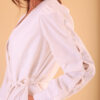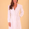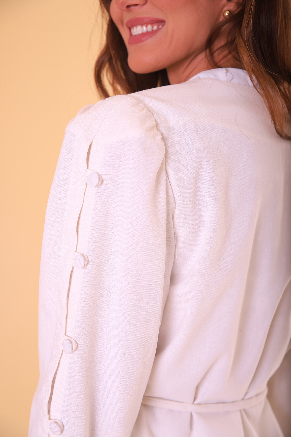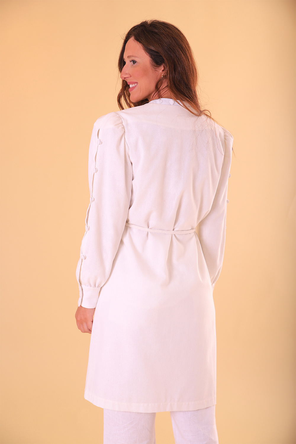 O jaleco PROVENCE é clássico, elegante e feminino. Transpassado, formando o decote em V, possui uma corda para acinturar inspirada nas cordas náuticas. De manga longa, em todo o seu comprimento possui botões forrados. Possui bolsos. Parte interna sem costura aparente.